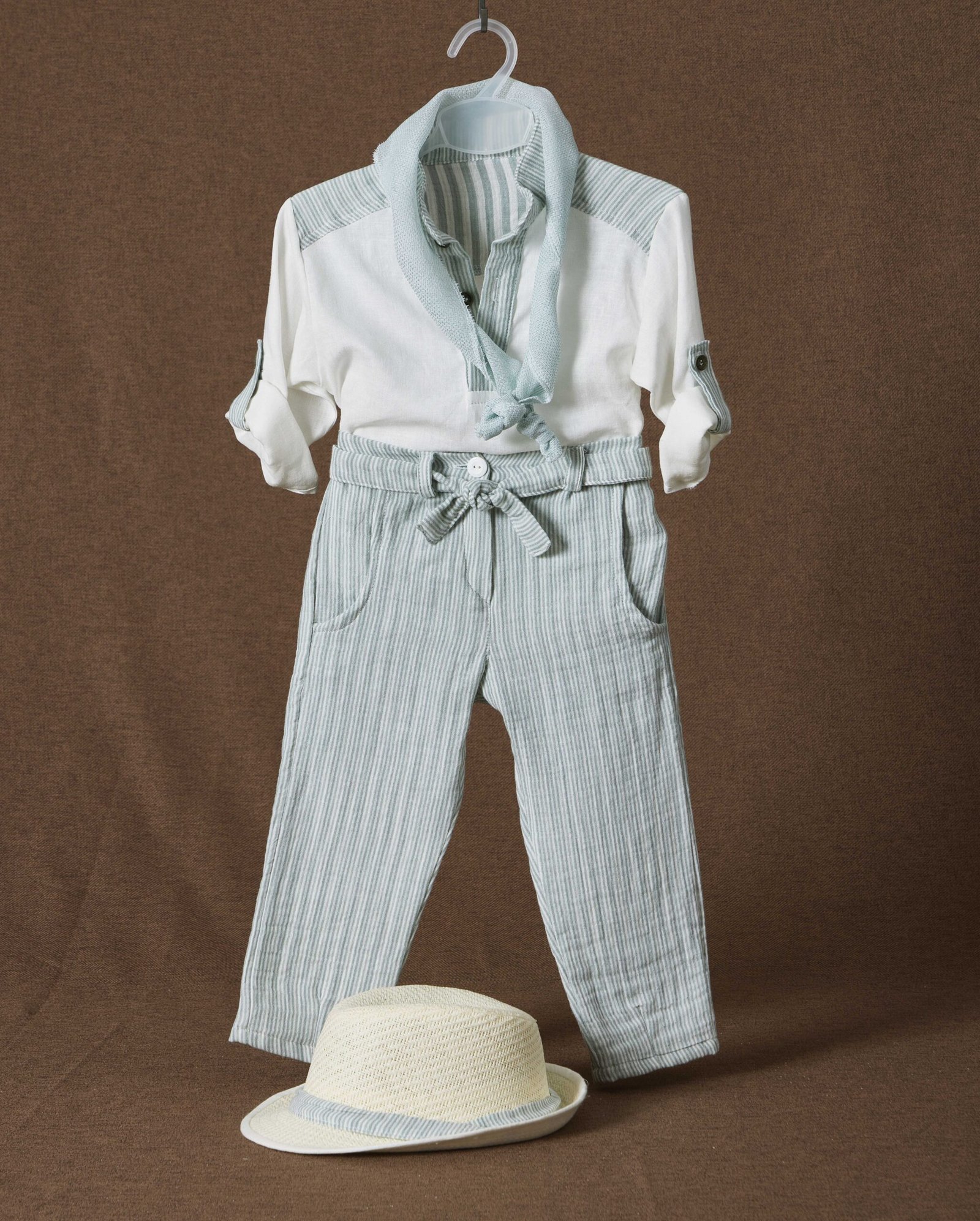 Πουκαμίσα με λεπτομέρεις από το παντελόνι σε μέντα αποχρώσεις.